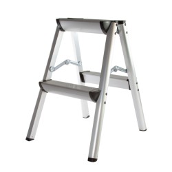 La struttura, composta da un gradino per lato e da una piattaforma superiore, offre stabilità e sicurezza grazie a superfici ampie, scanalate e antiscivolo, fissate saldamente ai montanti con rivetti rinforzati.