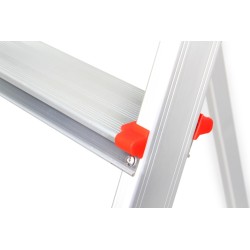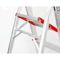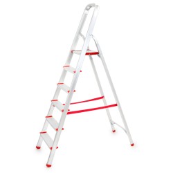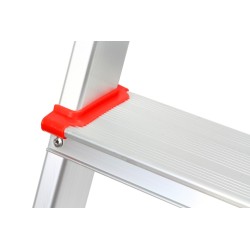La struttura, composta da cinque gradini e da una piattaforma superiore, offre stabilità e sicurezza grazie a superfici ampie, zigrinate e antiscivolo, fissate saldamente ai montanti con rivetti rinforzati.