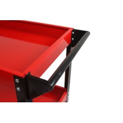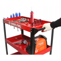 Il carrello a tre ripiani, realizzato in acciaio, è progettato per trasportare ed organizzare gli attrezzi, semplificando le operazioni e mantenendo l'ambiente di lavoro ordinato.