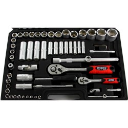 Il set contiene: Chiavi a bussola 1/4": 4, 4.5, 5, 5.5, 6, 7, 8, 9, 10, 11, 12, 13, 14 mm Chiavi a bussola 1/2": 14, 15, 16, 17, 18, 19, 20, 21, 24, 27, 30, 32 mm Chiavi a bussola lunghe da 1/4": 6, 7, 8, 9, 10, 11, 12, 13 mm Chiavi a bussola lunghe da 1/2": 14, 15, 17, 19 mm Chiavi a bussola per candele da 1/2": 16, 21 mm Chiavi combinate: 6, 8, 10, 13, 15, 17, 19, 22 mm Cacciavite x23 Punte per cacciavitePunte con inserto:PZ1, PZ2, PH1, PH2, FD4, FD5.5, FD7, HW3, HW4, HW5, HW6, T8, T10, T15, T25, T30 Manopola a cricchetto da 1/4" e 1/2" Prolunghe da 1/2" Giunto cardanico 1/4" e 1/2" Adattatore per inserti da 1/4"