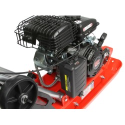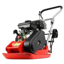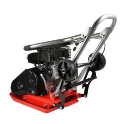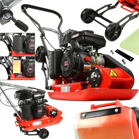 Il compattatore a scoppio, equipaggiato con una piastra metallica vibrante azionata da un motore, è progettato per la compattazione di substrati vari, come terreno e superfici stradali.
