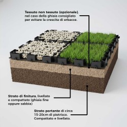 Riempimento: prato o ghiaia- Riempi con terra e semina l'erba: ottieni un prato carrabile o calpestabile che resiste molto meglio al passaggio, riducendo solchi e zone rovinate.
