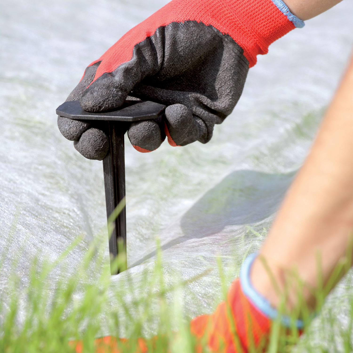 - Linserimento è semplice e rapido: è sufficiente spingere il picchetto nel terreno attraverso il telo, eventualmente aiutandosi con un martello in gomma.