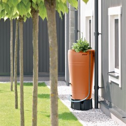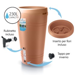 Il serbatoio è dotato di un'apertura superiore con inserto per fiori, due punti di attacco per il tubo di scarico della grondaia e due fori filettati per un rubinetto o un attacco rapido per il montaggio di un tubo da giardino.