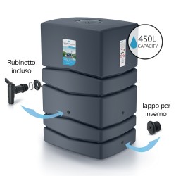 Il serbatoio è dotato di un'ampia apertura superiore con coperchio, quattro punti di attacco per il tubo di scarico della grondaia e due fori filettati per un rubinetto o un attacco rapido per il montaggio di un tubo da giardino.