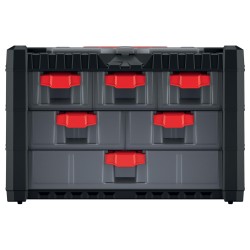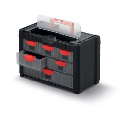 Organizer in plastica di colore nero e rosso, progettato per contenere e organizzare attrezzi e minuteria in modo pratico e versatile.