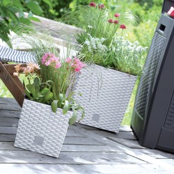 Questi vasi di plastica, dalla superficie simil rattan e dal design moderno, sono perfetti per creare un'atmosfera raffinata ed accogliente.