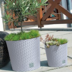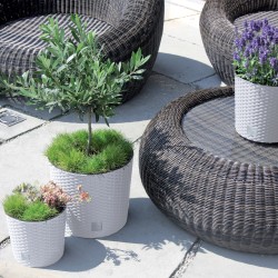 Questi vasi di plastica, dalla superficie simil rattan e dal design moderno, sono perfetti per creare un'atmosfera raffinata ed accogliente.